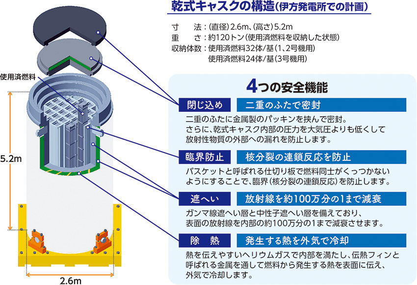 乾式貯蔵施設は、使用済燃料ピットで十分に冷却された使用済燃料を、「乾式キャスク」と呼ばれる金属製の頑丈な容器に収納して密封し、貯蔵する施設で、また、水や電気を使用せず、空気の自然な流れで冷却しながら貯蔵できるより安全性に優れた施設とされています。